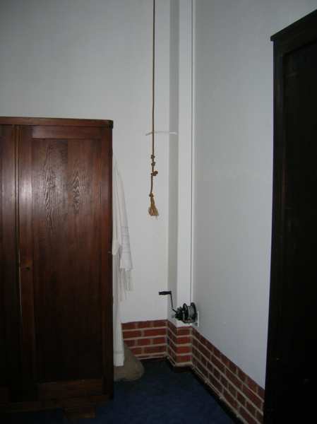 Da das Seil dazu in dem Windfang hing, benutzten die Ministranten es oft, um sich durch einen leichten Zug an dem Seil "anzumelden". Dann wußte der Pfarrer immer, dass einer seiner Ministranten unterwegs war.