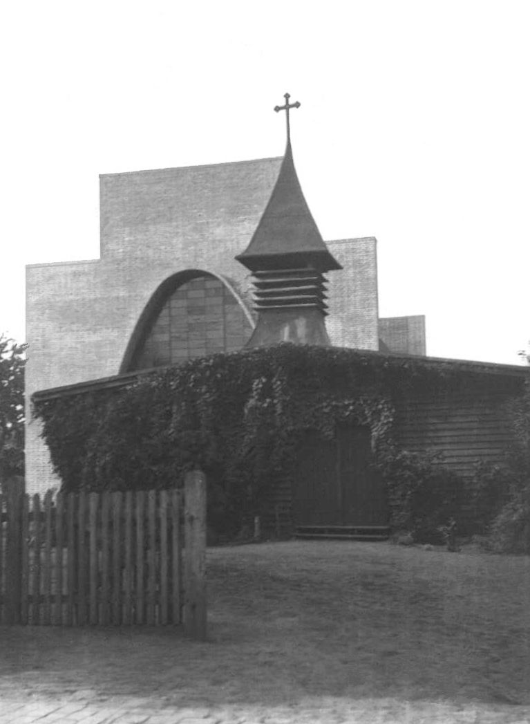 Über dem Windfang am Eingang dieser Barackenkirche stand das kleine hölzerne Türmchen, in dem nun die alte Glocke aus der Lagerkirche hing.